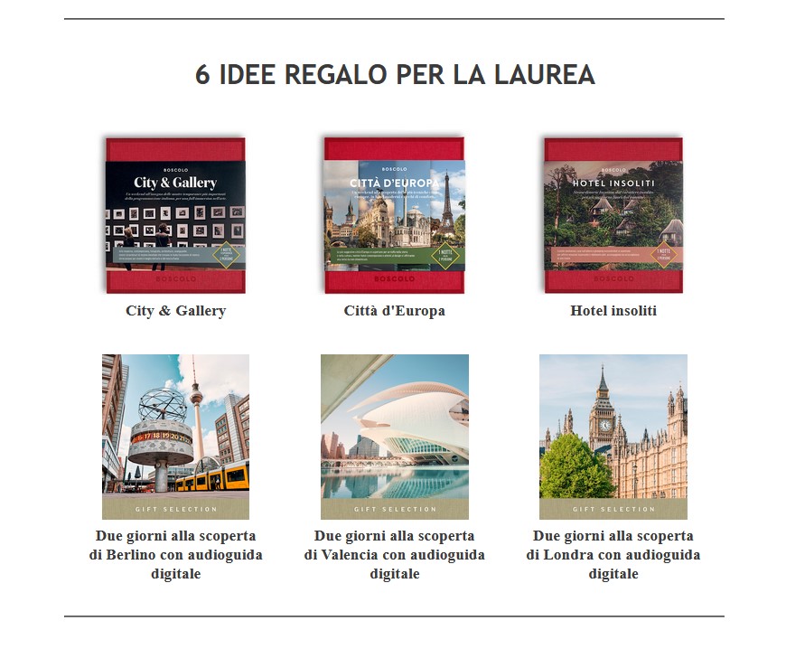 Guarda tra le proposte firmate Boscolo Gift e proponi ai tuoi clienti un regalo da 110 e lode! ome ad esempio una fuga di qualche giorno alla scoperta di città nuove, per dimenticare lo stress e dedicarsi alle proprie passioni, oppure una magica esperienza da ricordare.